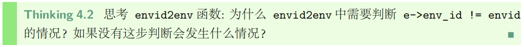 一个存在于env_free_list的进程控制块在被env_alloc函数调用时会被分配一个独一无二的envid,在其被env_free函数调用时会重新插入进env_free_list。当这个进程控制块被env_alloc函数再次调用时,其会被分配另一个envid。实质上这个进程控制块控制两个不同的进程。而当第一个envid被传入envid2env函数时,寻找的目标进程是第一个进程,函数会找到这个进程控制块,而此时该进程控制块控制着另一个进程,因此找到的是第二个进程。如果没有这步判断,函数找到的进程控制块可能不对应envid。