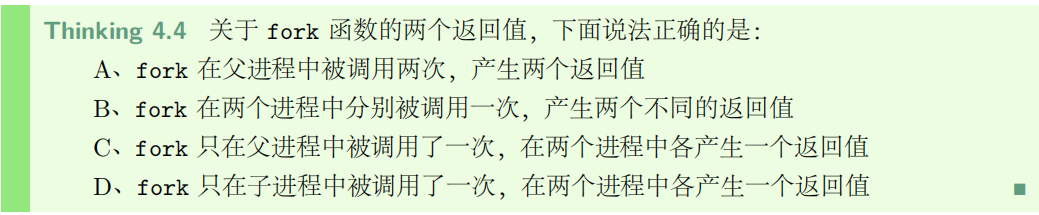 在子进程被调度时,上下文环境初于fork()函数内,虽然会返回值,但子进程没有真正意义上完整地调用fork()函数,因此fork()函数只在父进程中被调用了一次,但是在父进程中返回子进程的envid,在子进程中返回0,故选择C。